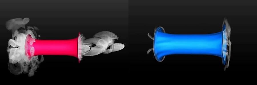 左側は従来のバスレフポートで気流の乱れが発生します。 右側は独自開発のツイステッドフレアポートで気流の乱れを抑え、空気の流れがスムーズになります。
