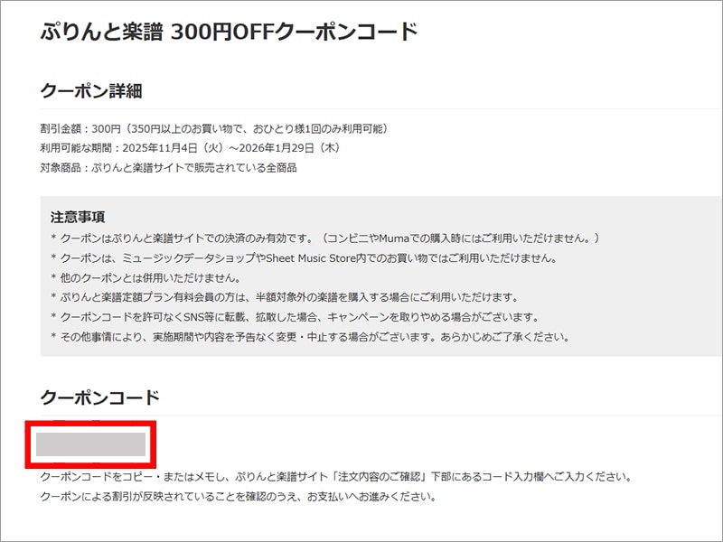 - クーポンは、ミュージックデータショップやSheet Music Store内でのお買い物ではご利用いただけません。