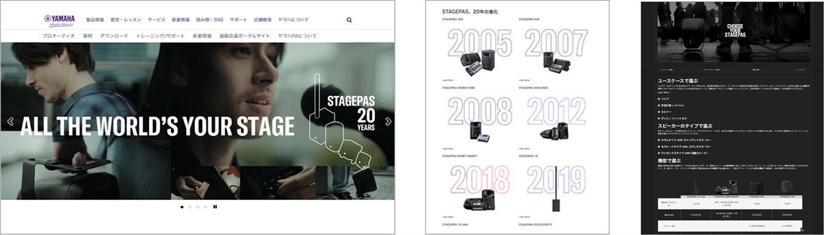 初代モデル「STAGEPAS 300」から最新モデル「STAGEPAS 200」「STAGEPAS 100」まで、STAGEPAS 20年の歴史を彩った全モデルを掲載。その特徴や進化の歴史をお楽しみいただけます。また目的やスタイル、機能で最適なSTAGEPASが選べるコンテンツも用意しています。
