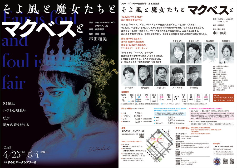 フライングシアター自由劇場の第5回公演『そよ風と魔女たちとマクベスと』は、シェイクスピア四大悲劇のひとつ『マクベス』を新たな古典として再創造した挑戦的な舞台です。