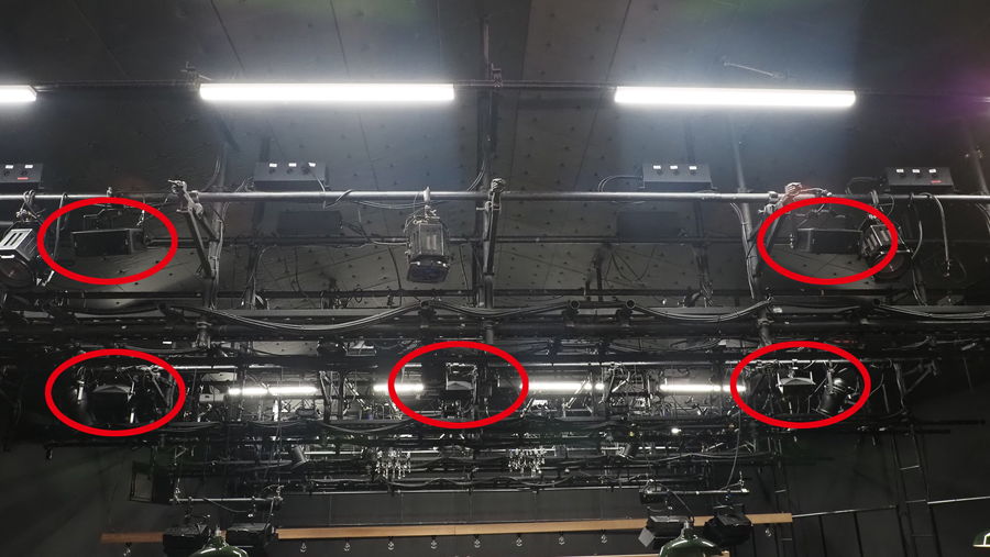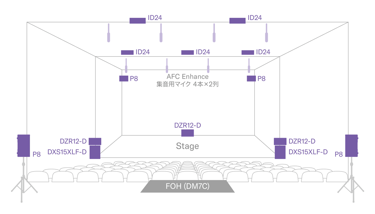 - 「AFC Enhance」用集音マイクを舞台上部の位置に4本、客席上方に4本吊下設置