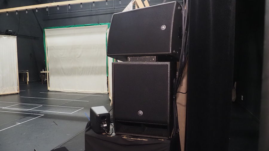 - ステージの上手脇、下手脇にサイドスピーカーとしてヤマハ「DZR12-D」+サブウーファー「DXS15XLF-D」を設置