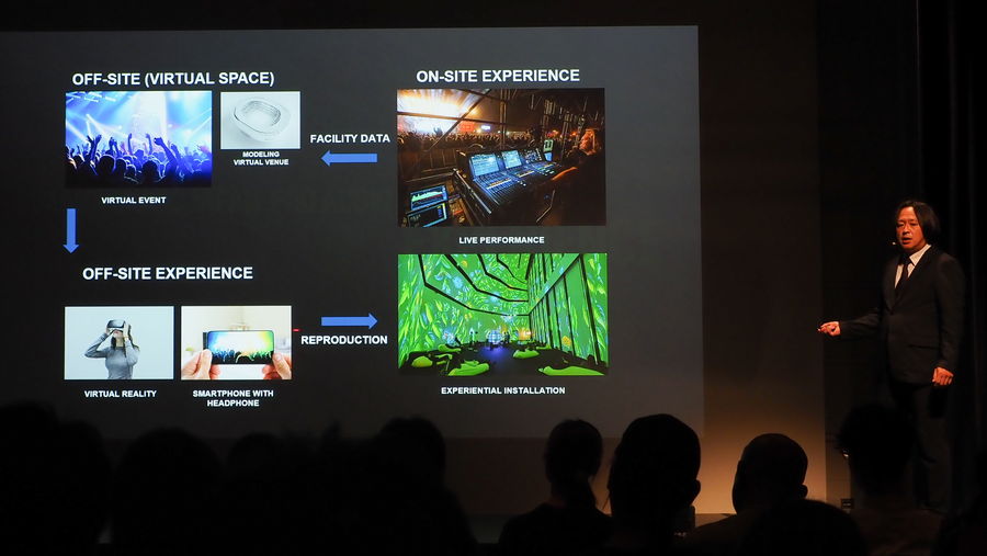 プレゼンテーションでは、まずヤマハが掲げる「Sound xR」というコンセプトについて説明がありました。「Sound xR」は、リアルとバーチャルの両面から至高のイマーシブ体験をすべての人に届けることを目指すヤマハのイマーシブソリューションの総称です。ヤマハが長年培ってきた空間音響技術と最新のデジタルソリューションを融合させ、リアルとバーチャルとの境界の無い音場体験の実現を目指しています。