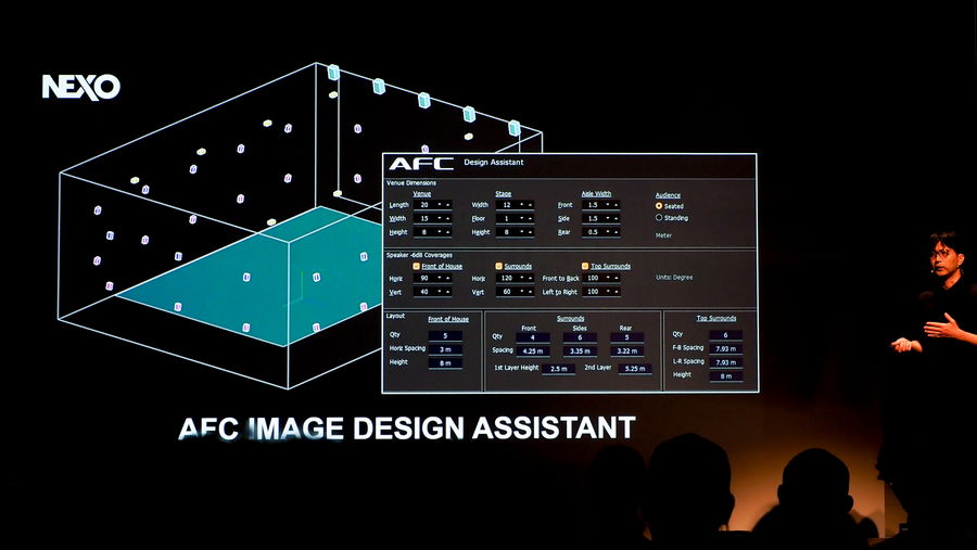 設計段階では、無償の音響シミュレーションソフト「NS-1」の「AFC Design Assistant」機能が実務を支えます。会場形状・客席エリア・指向性などの条件を入力すれば、スピーカーの台数・配置・高さが自動算出されるため、イマーシブオーディオシステムのベースプランを短時間で作成できます。さらにNEXOだけでなくヤマハのスピーカーも同一環境で検討可能です。設計データは「AFC Image Controller」へエクスポートできるため、制作から現場調整までスムーズに連携します。