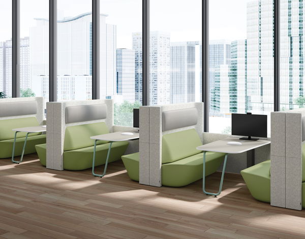 イトーキの「サウンドソファ」はヤマハの平面スピーカー「YFSシリーズ」やマイクロフォンを内蔵。スピーカーの音漏れを気にすることなく、オープンスペースでWeb会議ができる。