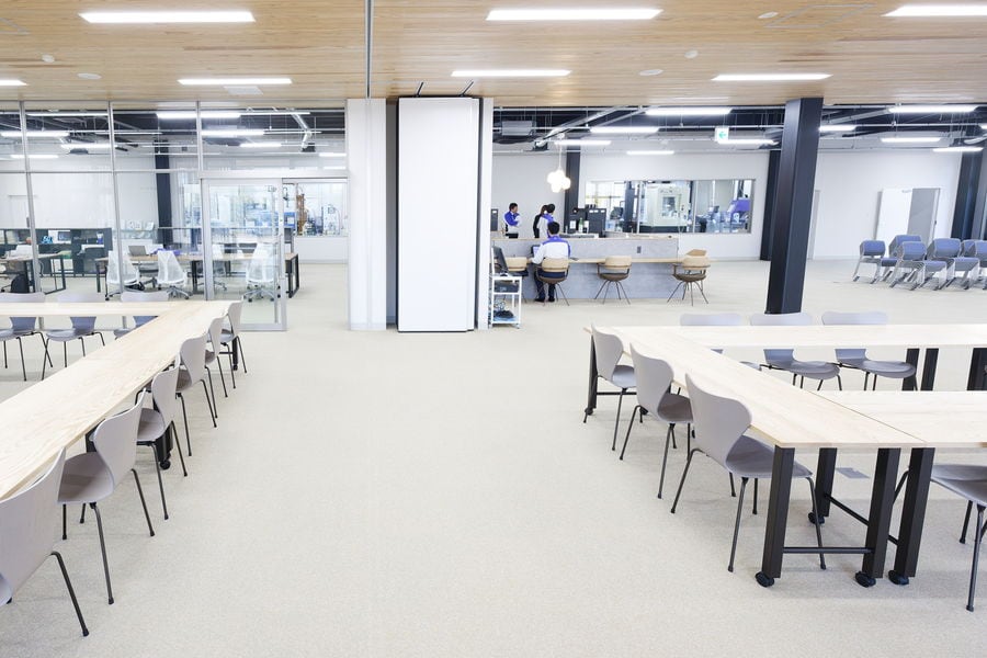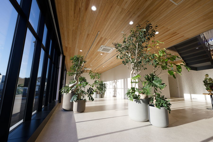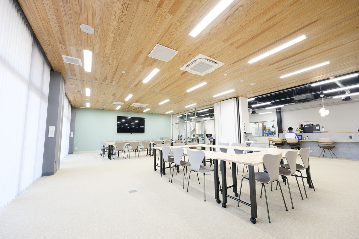 今回完成した新棟は、建物や内装、周囲の景観に至るまでデザインを一新した、これまでにない施設です。可変性を持たせた間仕切りのない空間には、カフェスペースや間接業務に携わる従業員がフリーアドレスで働くオフィス、畳敷きのフロアも設けられています。屋外には日本庭園を築くなど、日本らしさを感じさせる設えを随所に施しています。