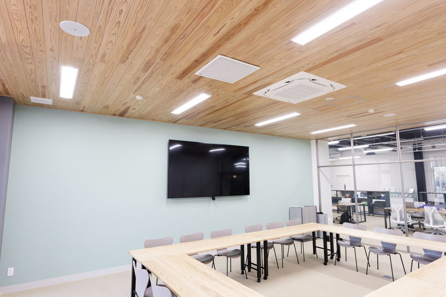 システム構成で重視したのは、見栄えのよさです。「YVC-1000」は本体とマイクをケーブルで接続するため、机まわりの配線がごちゃごちゃになる点が気になっていました。ちょうど新棟の設計プランを検討していた時期に、マイクもスピーカーも天井に設置できることを知り、ぜひ導入したいと考え、会議室には『ADECIAシーリングソリューション』の導入を即決しました。
