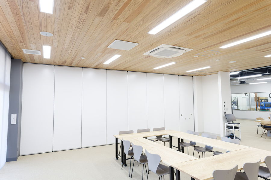 応接室、会議室ともに、遠隔会議用プロセッサー「RM-CR」とL2スイッチ「SWR2311P-10G」、シーリングスピーカー「VXC2P」を導入しています。会議室はスチールパーティションで分割/合同できる構造になっていて、分割時は“会議室1”が四方を仕切ったクローズドな空間、“会議室2”は二方向がオープンなエリアになります。2室を合同で使用すると、100人規模のセミナーにも対応できる広さです。