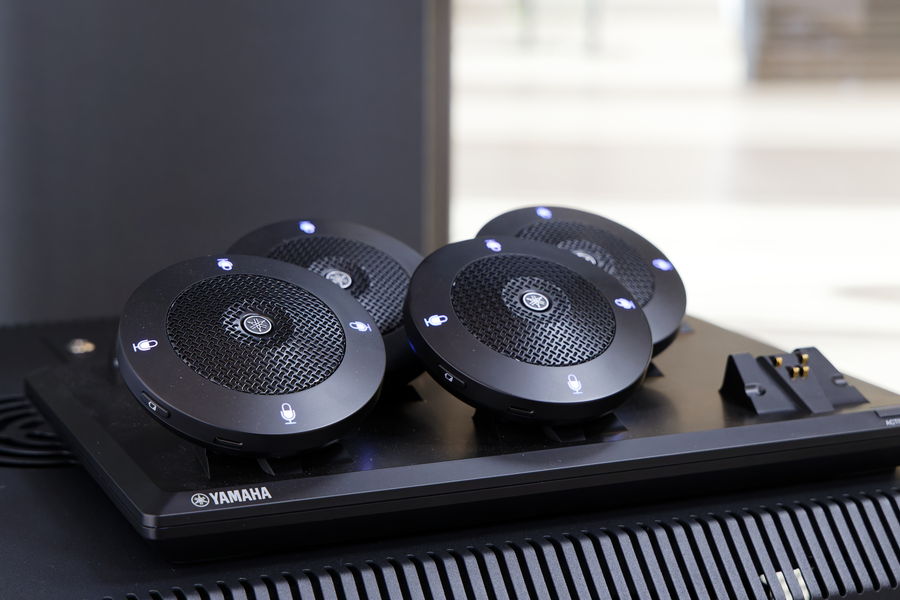 一方、応接室は、テーブルや椅子の配置がほぼ固定されているため、ワイヤレスのテーブルトップマイクロフォン「RM-WOM」を採用しました。