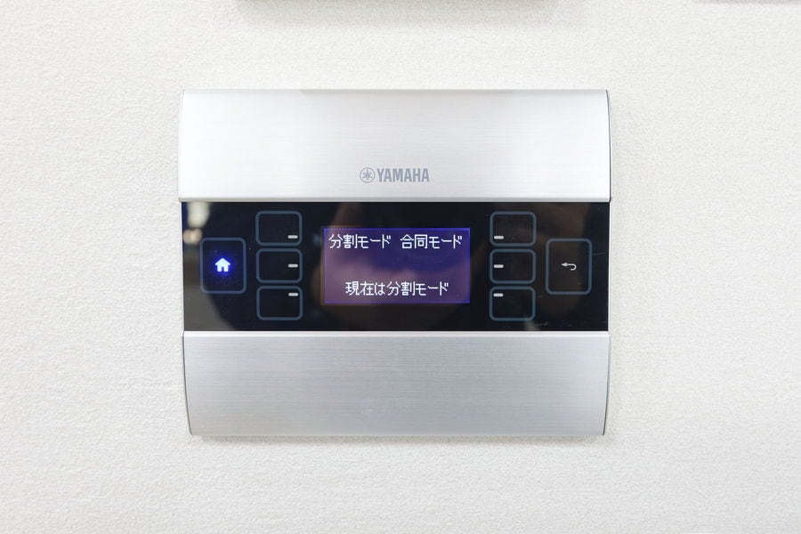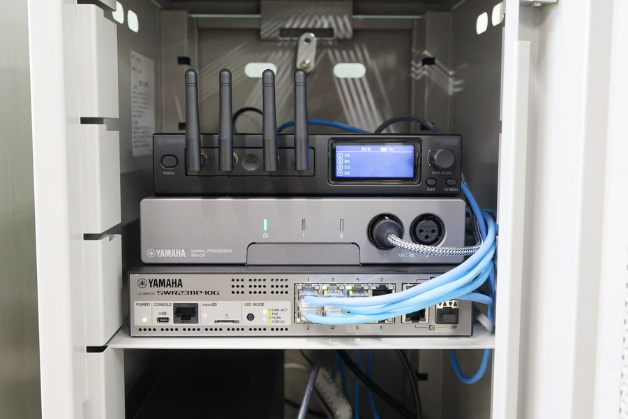 2分割した会議室を個々に使用する際の利便性を考慮し、各室に専用のラックを設置しています。分割時は各会議室の「RM-CR」で運用し、2室を合同で使用する際は、ウォールマウントコントローラー「MCP1」で運用パターンを切り替えています。複雑な制御も、タップ操作するだけで瞬時に切り替えられるため、誰でも直感的に運用ができる点が非常に便利です。