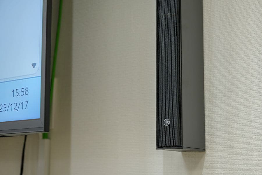 それから、スピーカーの音も素晴らしいです。モニターの横に壁掛けしていますが、非常にスリムでテレビと一体化しています。こんなにスリムなのに音質は驚くほど良く、まるで映画館のような臨場感です。しかもスピーカーの近くの席でもうるさすぎず、部屋の隅の席でも声がはっきりと聞こえる性能には感心しました。