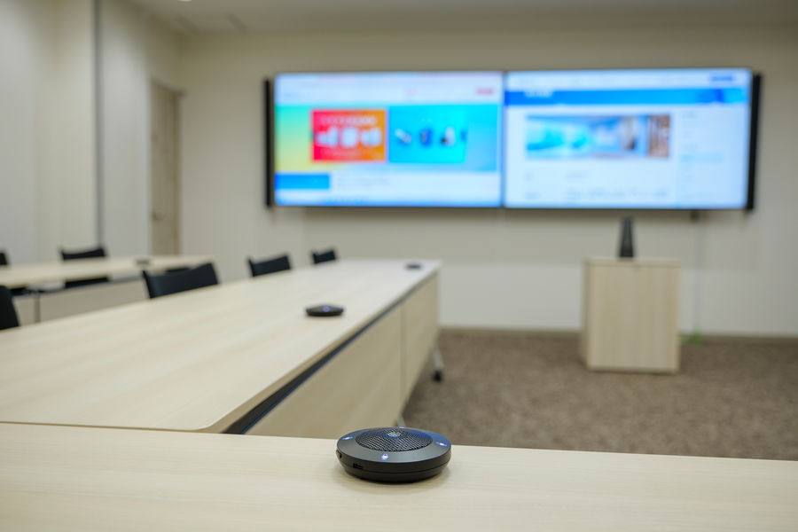 遠隔会議用の有線スピーカーとマイクを使っていました。会議では約20名が参加しますが、従来のシステムだと発言者の声を拾いきれなかったり、準備に時間がかかったり、設定ミスでうまく接続できなかったりといった問題が発生していました。