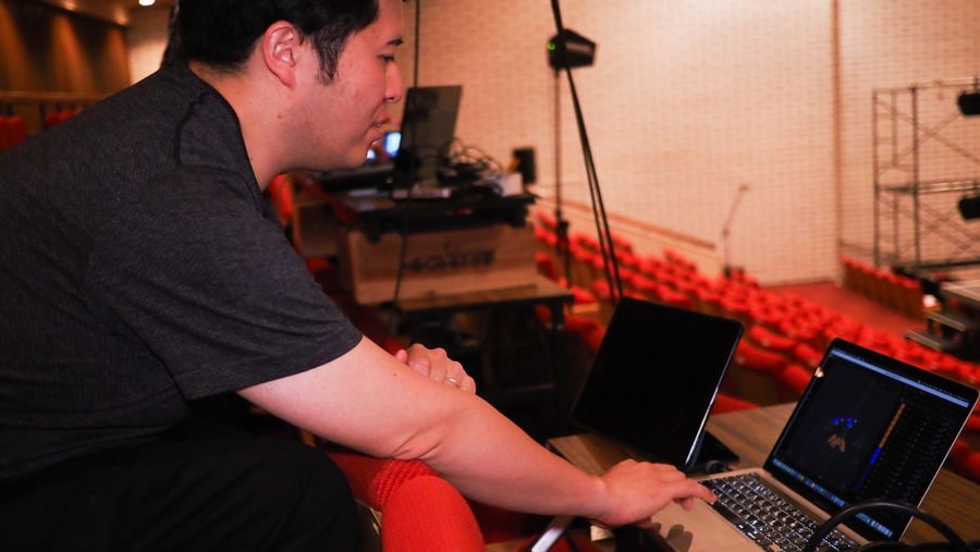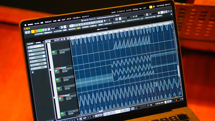 この作品は生演奏、歌手や役者の生の声、そして「Nuendo」で制作した立体音響の再生音源を精密に同期させながら進行させるという、非常に複雑な構造になっています。