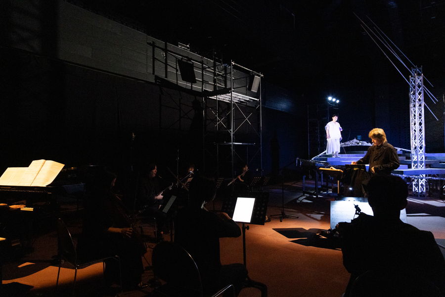 この作品は、私と平田さんが提唱する「シアターオペラ」という新しい総合芸術の試みの第2弾です。現代音楽、現代演劇、現代美術などを一つの枠にまとめ、舞台上に立ち上げることを目指しています。演劇パートでは宇宙から地球へ降り立つように「言葉を獲得していく人間」が描かれます。一方で歌手は、崩壊していく宇宙の断片や言葉のかけらを拾い集め、壊れた時間や記憶を組み立て直していく存在として登場します。