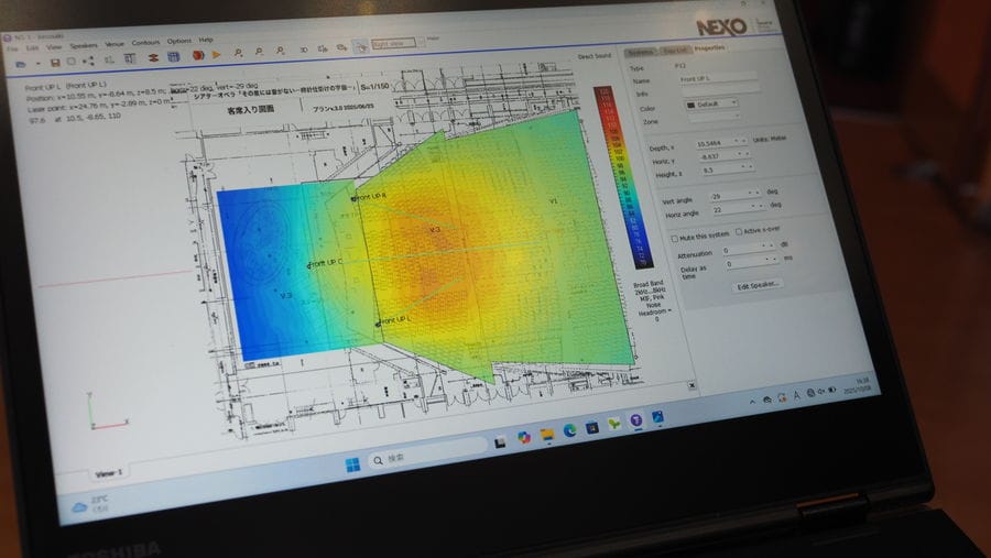 NEXOのシミュレーションソフトウェア「NS-1」も良かったですね。ザ・ヒロサワ・シティ会館 大ホールでのスピーカー設置でも活用しました。というのも、あの会場の場合、オーケストラピット上のプロセニアムに吊り込んだL/Rスピーカーは構造上、一度仕込むとバトンを下ろせず、「鳴らしてみてから微調整する」という、角度調整が行えません。そのため事前に「NS-1」で縦と横の振り角を事前に細かく算出しました。