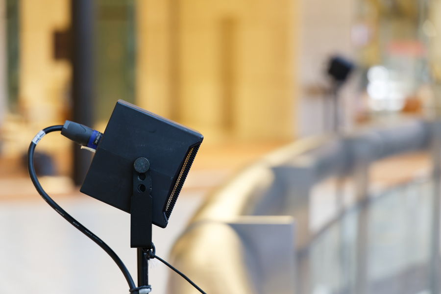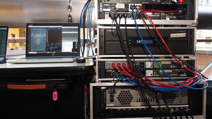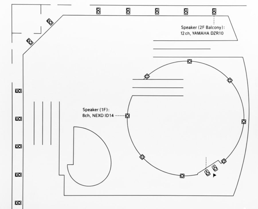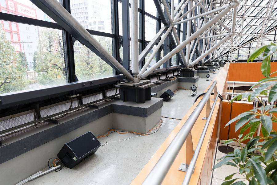 1階には吹き抜け部分を囲うように指向性制御に優れたNEXO製スピーカー「ID14」を8台設置。2階のガラス張りの壁面近くにはヤマハパワードスピーカー「DZR10」を12台設置。これらによって建物全体に響き渡る残響が再生されました。