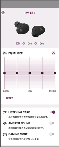・TW-E7Bのみ:ADVANCED ANC(アドバンスドアクティ ブ・ノイズ・キャンセリング)、LISTENING CARE -Advanced(リスニングケアアドバンスド)、LISTENING OPTIMIZER(リスニングオプティマイザー)、装着検出などののON/OFFを切替えることができます。