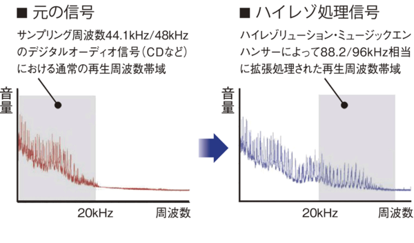 圧縮音声を活き活きと再現する通常のミュージックエンハンサーに加えて、非圧縮(PCM、WAV)および可逆圧縮(FLAC)音声を最大96kHz/24bit分解能まで拡張処理するハイレゾリューション・ミュージックエンハンサーを搭載。オーディオソースから、よりデリケートな音楽的表現を引き出します。