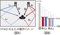 室内の壁や床からの不規則な初期反射音はオーディオ(シアター)再生に悪影響を及ぼす原因のひとつです。初期反射音を厳密に制御してホームシアターの臨場感を飛躍的に高める「YPAO-R.S.C.」は、左右のスピーカーの設置環境が異なる場所での不規則な初期反射音(図A)をデジタル音場処理技術で補正(図B)し、よりバランスの整った視聴空間をつくり出す事ができます。また、複数の計測ポイントからのデータを総合的に判断して計測精度を向上させる「マルチポイント計測」、室内の音響特性に合わせてシネマDSP効果を最適化する「DSPエフェクトレベルノーマライズ」、視聴位置とスピーカーとの位置関係を把握して調整に反映できる「スピーカー角度計測」といった高度な計測・調整機能を、視聴環境最適化システム「YPAO」で実現。専用施工されたシアタールームで楽しむような理想の視聴環境を簡単な操作で再現できる、ヤマハだけの先進機能です。