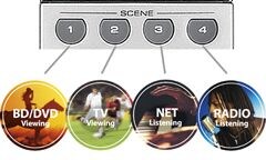 シネマDSPプログラムや音量/音質調整、パワーアンプアサインなどの各種設定を入力ソースごとに記憶してワンタッチで呼び出せるSCENE(シーン)機能。視聴したいソースのボタンを1回押すだけでAVレシーバーの電源がオンになり、再生環境のセットアップが瞬時に完了します。