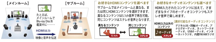 本機を設置した部屋(メインルーム)でシアター再生を楽しみながら、メインルームと異なる任意のAVコンテンツを、寝室やキッチンなどの別室に設置したHDMI対応テレビやホームシアターに伝送して同時再生できる「HDMIゾーンスイッチング」に対応。HDMI入力されたAVコンテンツはもちろん、デジタルまたはアナログ入力されたオーディオコンテンツ、内蔵ネットワークレシーバー(インターネットラジオ、USBオーディオ含む)、内蔵FM/AMのいずれかを選んで伝送することも可能になりました。別室のHDMI対応テレビやAVアンプ、YSPなどでメインルームと同じ、または異なるコンテンツを楽しめるので、寝室やキッチンに移動して作品の続きを観賞したり、家族が別々のコンテンツを楽しむときに便利です。