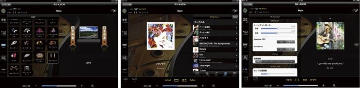 iPod touch/ iPhone/iPadやAndroid端末を使ってヤマハ AVアンプの操作が行える*¹専用アプリケーション「AV CONTROLLER*²」に対応。電源オン/オフや音量調整、入力ソース選択、シネマDSPのサラウンドモード選択、本機に入力されたAVコンテンツを別室のシステムで同時に楽しめるゾーン機能などをリモコン感覚で快適にコントロールできるほか、iPod touch/iPhone/iPadやAndroidスマートフォン/タブレット内の音楽コンテンツを高音質でワイヤレス再生できるヤマハオリジナルの音楽再生機能も搭載しています。動作が緩慢になりがちなネットワークオーディオの選曲もサクサク動く快適な操作感、タブレットの縦横切り替え表示に対応した機能的で美しい画面も魅力です。