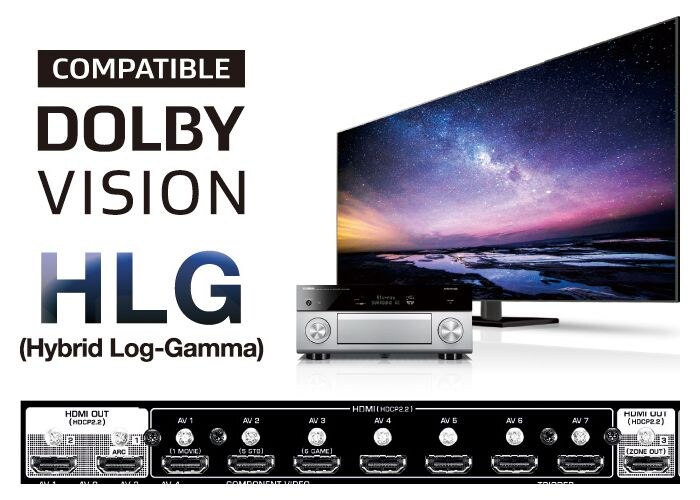 HDR映像伝送やBT.2020映像伝送、HDCP2.2、4K/60p 4:4:4 映像信号のパススルー/4Kアップスケーリングに対応した7入力/3出力*¹のHDMI端子を装備しました。広範な色域と大きく拡張されたダイナミックレンジによって華やかな色彩や豊かなディテールを再現する高画質技術「Dolby Vision™」、放送局が推奨するHDR方式「Hybrid Log-Gamma」、これまでのオーディオリターンチャンネル(ARC)機能に加えてロスレス音声やオブジェクトオーディオも伝送可能としたeARC*²にも対応し、Ultra HD Blu-rayプレーヤーなど複数の対応機器を接続して画質を損なうことなく楽しめます。
