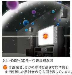 独自の音場創生技術「シネマDSP<3Dモード>」を搭載。シネマDSP<3Dモード>を通常の5.1chスピーカー構成で実現するVPS(バーチャル・プレゼンス・スピーカー)機能も搭載し、最新の大画面テレビにふさわしい圧倒的な立体音場を再現できます。