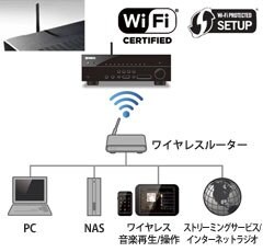 家庭内ネットワークへ無線LAN経由で接続できるWi-Fi機能を内蔵し、インターネットと接続した無線LANルーターの電波が届く範囲ならLANケーブルを接続しなくても、ネットワークオーディオや「AV CONTROLLER」(ヤマハAVアンプ専用アプリケーション、後述)でのワイヤレス操作を実現。無線LANルーターとの接続はWPS(プッシュボタンまたはPINコード)で簡単に行うことができ、さらにiOS端末(iPhone/iPad/iPod Touch)*を既にお使いの場合、端末側のインターネット接続設定を本機にコピーして本機側のインターネット接続設定を簡略化することが可能です。これらの装備により、多彩なネットワーク機能をより手軽にお楽しみいただけるようになりました。
