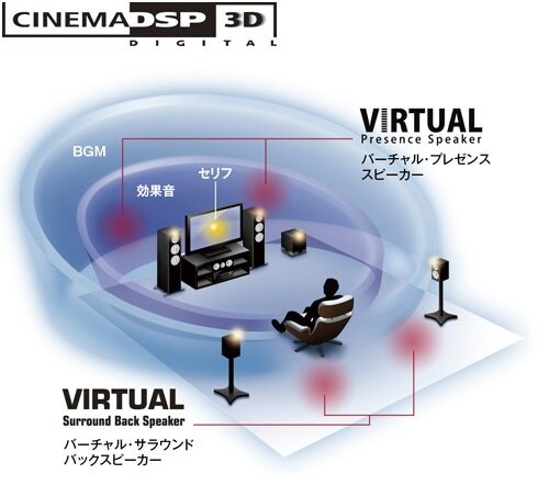 サラウンド(リア)スピーカーをメイン(フロント)スピーカーと並べて設置した状態で7.1chサラウンド再生が楽しめるバーチャルサラウンド技術「Virtual CINEMA FRONT」(バーチャルシネマフロント)を採用。視聴ポイントの後方にスピーカーを設置できない環境でも、従来のVirtual CINEMA DSP(サラウンドスピーカーを使用しないバーチャルサラウンド再生)を上回る、臨場感豊かなサラウンド再生をより省スペースで実現します。