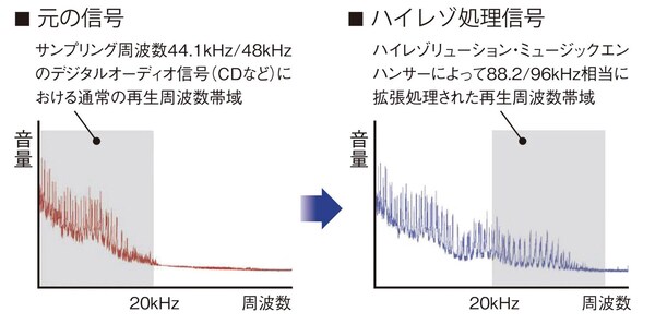圧縮音声を活き活きと再現するミュージックエンハンサーに加えて、非圧縮(PCM、WAV)および可逆圧縮(FLAC)音声を最大96kHz/24bit分解能まで拡張処理するハイレゾリューション・ミュージックエンハンサーも搭載。よりデリケートな音楽的表現を引き出し、ピュアオーディオ再生の新たな楽しさを提供します。