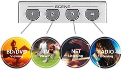 シネマDSPプログラムや音量/音質調整、パワーアンプアサインなどの各種設定を入力ソースごとに記憶してワンタッチで呼び出せるSCENE(シーン)機能。Blu-ray Discからインターネットコンテンツまで、視聴したいソースのボタンを押すだけでAVレシーバーの電源がオンになり、各ソースを楽しむための再生環境へのセットアップが瞬時に完了します。