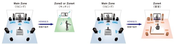 本機を設置した部屋(メインルーム)でシアター再生を楽しみながら、同じAVコンテンツやメインルームと異なるAVコンテンツを、寝室やキッチンなどに設置したHDMI対応テレビやホームシアターに伝送して同時再生できるZone対応HDMI出力を新たに装備。HDMI対応テレビを接続して映像と音声(2chにダウンミックスされたもの)をHDMIケーブル1本で伝送でき、別のコンテンツをテレビだけで楽しめます。さらにスピーカーを増設することでTV映像とスピーカー再生を組み合わせた楽しみも実現できます。また、HDMI対応ホームシアター(AVアンプを含む)を接続した場合には、HDMI入力されたコンテンツをHDMIケーブル1本で伝送、メインルームと別々のマルチチャンネルコンテンツを再生することができます。