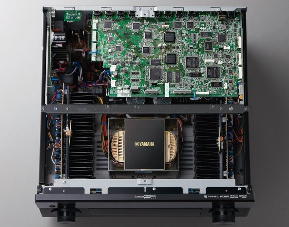 ヤマハが培ってきた機構設計のノウハウを集約し、理想の機械的強度と重量バランスを発揮する左右対称コンストラクションの制振・高剛性シャーシを採用。設置安定性を高めて筐体の共振を分散し、電源トランスの微細な振動をも抑制するアンチレゾナンステクノロジー(Anti Resonance Technology)を応用した<5番目の脚>とも相まって、力強くフォーカスの合ったサウンドを実現します。また電源部には、オーディオ回路用、デジタル回路用、FLディスプレイ回路用をそれぞれ独立させて全動作モードでのS/Nを高めた3回路分離型パワーサプライを搭載。給電経路を最短化するとともに、音質に影響を与える磁場効果も給電レイアウトの工夫によりキャンセルすることで、音の瞬発力とリアリティをいっそう高めています。