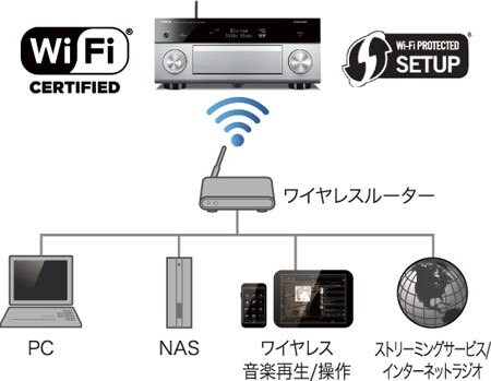 家庭内ネットワークへ無線LAN経由で接続できるWi-Fi機能を内蔵し、インターネットと接続した無線LANルーターとの接続でLANケーブルを接続しなくても、ハイレゾ音源を含むネットワーク上の音楽コンテンツやインターネットラジオの再生、専用アプリ「AV CONTROLLER」での本機のワイヤレス操作を実現。さらに、スマートフォン/タブレット内の音楽コンテンツのワイヤレス再生や、「AV CONTROLLER」での操作などが無線LAN環境のない場所で手軽に行える「Wireless Direct」も内蔵しています。