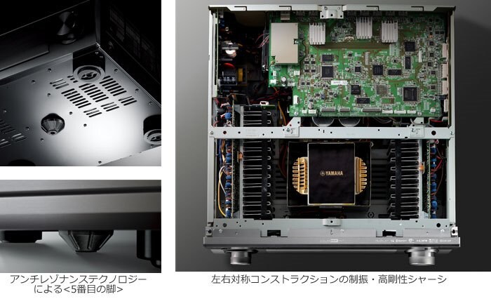 ヤマハが培ってきた機構設計のノウハウを集約し、理想の機械的強度と重量バランスを発揮する左右対称コンストラクション+H型クロスフレーム+ダブルボトム構造の制振・高剛性シャーシを採用。AVENTAGEの象徴というべきアンチレゾナンステクノロジー(Anti Resonance Technology)による〈5番目の脚〉が、設置安定性を高めて筐体の共振を分散するとともに電源トランスの微細な振動をも抑制し、力強くフォーカスの合ったサウンドを再現します。