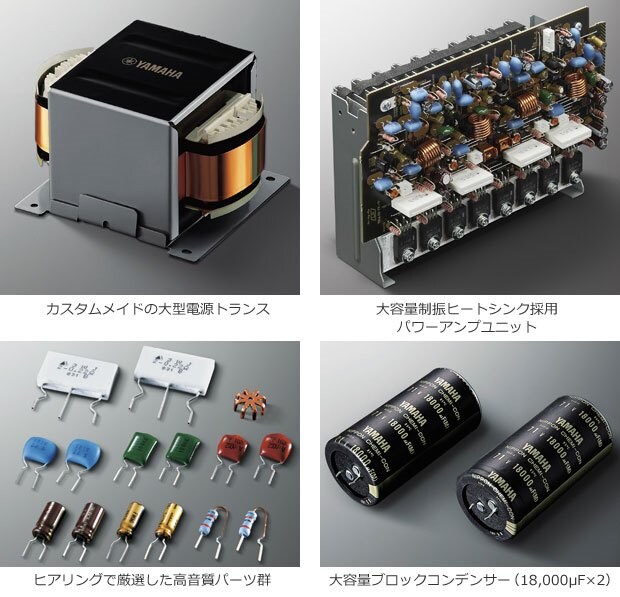 左右対称レイアウトのフルディスクリート構成9chハイパワーアンプ、オーディオ入力部とD/Aコンバーター部の電位差を解消して微小信号の再生品位を高めるD.O.P.G.(DAC on Pure Ground)コンセプト、デジタル音声入力の信号精度を高めるウルトラロージッターPLL回路などAVENTAGE基準の高音質設計を実践。D/Aコンバーターには微小信号の再現性とS/N感に優れたESS社製「ES9016」と「SABRE9006A」を各1基ずつ投入しています。加えて、ローム社との共同開発による高精度電子ボリュームや、ルビコン社とのコラボレーションで専用に音質調整されたオリジナルPML(薄膜高分子積層)コンデンサなどを駆使した入念な音質チューニングにより、ヤマハAVレシーバーの特長である「音の静寂性」と全帯域にわたる解像度をさらなる次元へ高めました。