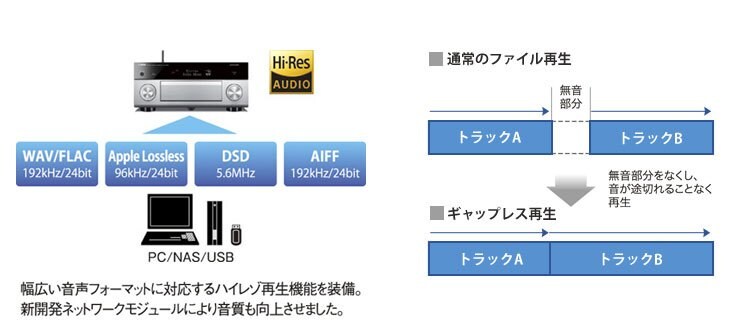 ネットワークオーディオ部はWAV/FLAC 192kHz/24bit再生、Apple Lossless 96kHz/24bit再生に加えて、新たにDSD 5.6MHz再生(DSDダイレクト再生対応)およびAIFF 192kHz/24bit再生にも対応。パソコンやNAS(ネットワークHDD)などにストックした大量の音楽ライブラリーも、選曲レスポンスの速さで定評のある専用アプリ「AV CONTROLLER」を使えばストレスなく快適に聴くことができます。ネットワーク再生では、ライブ演奏やクラシック音楽などで気になる曲間の音の途切れを解消するギャップレス再生にも対応。お気に入りのインターネットラジオ局をメモリーして素早く呼び出したり、聴取中にソースの切り換えや電源オン/オフを行っても直前まで聞いていた局を保持するvTuner*ブックマーク&オートプレイも装備し、インターネットラジオも快適にお楽しみいただけます。