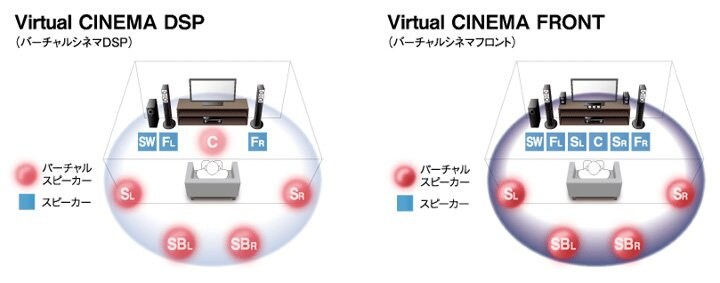 サラウンド(リア)スピーカーをメイン(フロント)スピーカーと並べて設置した状態で5.1chサラウンド再生が楽しめるバーチャルサラウンド技術「Virtual CINEMA FRONT」(バーチャルシネマフロント)を採用。視聴ポイントの後方にスピーカーを設置できない環境でも、従来のVirtual CINEMA DSP(サラウンドスピーカーを使用しないバーチャルサラウンド再生)を上回る、臨場感豊かなサラウンド再生をより省スペースで実現します。