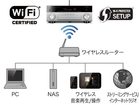 家庭内ネットワークへ無線LAN経由で接続できるWi-Fi機能を内蔵し、LANケーブルを接続しなくても、ハイレゾ音源を含むネットワーク上の音楽コンテンツやインターネットラジオの再生、「AV CONTROLLER」アプリでの本機のワイヤレス操作を実現しました。さらに、スマートフォン/タブレット内の音楽コンテンツのワイヤレス再生や、「AV CONTROLLER」での操作などが無線LAN環境のない場所で手軽に行える「Wireless Direct」も内蔵しています。
