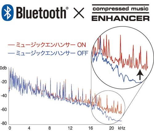 スマートフォンやタブレットなど、お手持ちのBluetoothⓇ対応機器の音声を本機でワイヤレス再生(受信)したり、本機の音声*をBluetoothⓇ対応ヘッドホンやスピーカーなどで聴ける(送信)、BluetoothⓇオーディオ機能を搭載しました。本機のBluetoothⓇ機能(受信)は高音質のAACフォーマットに対応し、さらに高音域の情報量や低音域の明瞭度が失われがちな圧縮音声を効果的に補正(下図参照)するBluetoothⓇ対応ミュージックエンハンサーとも相まって、より奥行きのあるクリアな音質を実現しています。