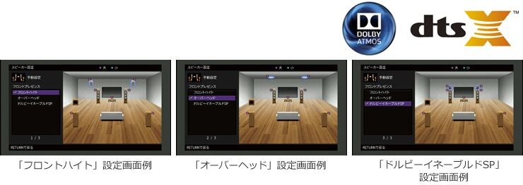 ドルビーラボラトリーズ社が開発したDolby AtmosⓇ(ドルビーアトモス)やDTS社が開発したDTS:X™(ディーティーエス エックス)」など、最新の3次元サラウンドフォーマットに対応したサラウンドデコーダーを搭載しました。個々の音を、頭上を含めた室内のどの位置にも定位または移動させ、3次元的な音響空間を簡単に創り上げることのできるこの技術への対応により、最新映画で話題のリアルな包囲感や移動感を家庭のシアタールームで楽しめます。5.1.2chスピーカー構成に対応し、プレゼンススピーカーはフロントスピーカー上方壁に設置する「フロントハイト」、天井に設置する「オーバーヘッド」、「ドルビーイネーブルドスピーカー」の3パターンから選択できます。またDTS:X™再生時には「DTSダイアログコントロール*」でセリフ音量の単独調整も可能です。