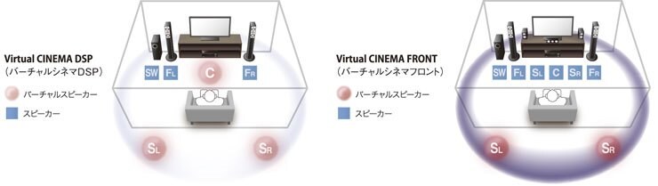 今回新しく、サラウンド(リア)スピーカーをメイン(フロント)スピーカーと並べて設置した状態で5.1chサラウンド再生が楽しめるバーチャルサラウンド技術「Virtual CINEMA FRONT」(バーチャルシネマフロント)を採用。視聴ポイントの後方にスピーカーを設置できない環境でも、従来のVirtual CINEMA DSP(サラウンドスピーカーを使用しないバーチャルサラウンド再生)を上回る、臨場感豊かなサラウンド再生をより省スペースで実現します。