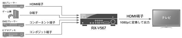 さざまな映像の入力信号をHDMI 1本で出力。アップコンバージョン機能を搭載