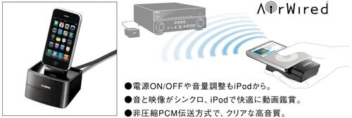 別売のiPod用ワイヤレスシステム「YID-W10」を使えば、iPhone/iPodの曲をワイヤレスで再生可能。トランスミッターを装着したiPhone/iPodをリモコンにするような感覚で、手元から再生や選曲をはじめAVアンプ本体の電源のON/OFF、音量の調整まで操作できます。独自のワイヤレス技術「AirWired」を採用し、音質劣化や音の遅延もほとんどない自然な再生を実現。さらに、ミュージックエンハンサーやシネマDSPを使用して、高音質なサラウンド再生も楽しめます。