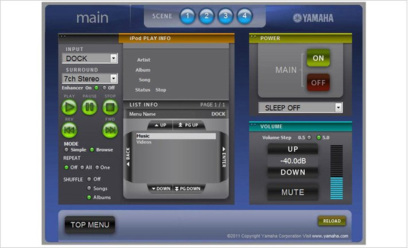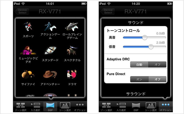 本機を家庭内ネットワークに接続*¹することで、iPhoneやパソコンを利用した快適操作が行えます。App Storeから無償でダウンロードできる、日本語対応の専用App「AV CONTROLLER」をインストールすれば、iPhoneやiPod touch、iPadから本機をコントロール可能。電源のON/OFF、ボリューム調節、入力ソースの切り換えなどの基本操作をはじめ、シネマDSPの豊富な音場プログラムの利用やZONE(マルチルーム)の選択まで、さまざまな操作が視聴時の暗い室内でも直感的に行えます。さらに、ウェブブラウザー*²経由での操作を実現する、ウェブコントロールセンターも搭載。パソコン画面上のグラフィカルな表示で、快適にAVアンプを操れます。