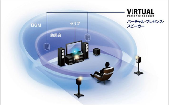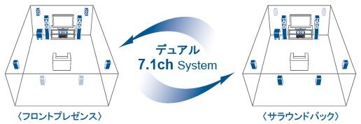 入力されたサラウンドフォーマットや選択したシネマDSPプログラムに応じて、フロントプレゼンススピーカーを使った7.1ch再生と、サラウンドバックスピーカーを使った7.1ch再生とを自動で選択します。