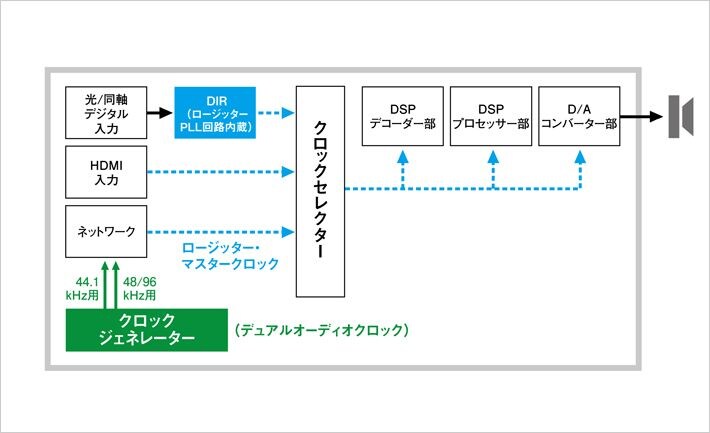 「ワイドレンジで高解像度な、本格派の高音質」という評価をいただいた前モデル(RX-V767)を踏襲しながら、高音質オペアンプやカスタムオーダーによるポリプロピレンコンデンサー、抵抗器など、アンプ回路の構成部品をリスニングテストに基づいて再選定しました。電源部では、FLディスプレイ用電源をメイントランスから独立させることでさらなるノイズ低減に成功。外部機器からのジッター侵入を阻止して高音質を守る、ロージッターPLL回路も採用しています。これらの音質最優先設計によって、あらゆるコンテンツをより鮮明でダイナミックな、S/N感の高い再生音でお楽しみいただけるようになりました。さらにネットワーク部には、デジタル信号の精度を向上させるデュアルオーディオクロック(44.1/88.2kHz用と48/96kHz用の個別クロック)を新搭載。ネットワークオーディオ再生のさらなる高音質化に貢献しています。