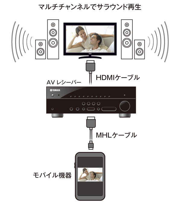 MHL対応の携帯端末*¹をフロント端子に接続して最大フルHD(1080p)映像と最大7.1chのマルチチャンネル音声の伝送、さらには本機側リモコンでの端末操作*²も実現するMHL(Mobile High-Definition Link)*³をはじめ、4K Ultra HDおよび3D映像伝送、主要メーカー製テレビ/レコーダーとのリンク機能*⁴などに対応した合計6入力/2出力の最新HDMI端子を搭載。もちろん、テレビ側のデジタル音声をHDMI経由でAVレシーバーへ伝送できるオーディオリターンチャンネル(ARC)の採用により、テレビとの接続もHDMIケーブル1本ですっきりとまとめることができます。