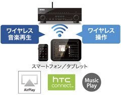 無線LAN環境がなくてもAirPlay、HTC Connect、専用アプリ「AV CONTROLLER」によるワイヤレス音楽再生や、ワイヤレス操作を可能にするヤマハ独自の新機能「Wireless Direct」(ワイヤレスダイレクト)を搭載。家庭内ネットワークやLANルーターを経由せず、お手持ちのスマートフォン/タブレットと本機とをダイレクトに無線接続できるので、インターネットに接続できない場所や無線LANの電波が届かない場所でもお使いいただけます。
